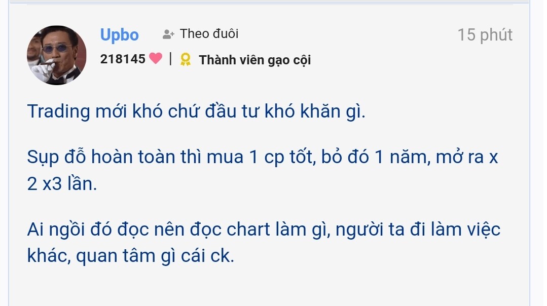 đúng rồi bác,nên mới đọc rất khó hiểu logic của mấy phiên test. bởi vậy em mới nhờ mấy cao nhân đã có kinh nghiệm chỉ dạy,là biến tấu thế nào để áp dụng vào tt VN. ví dụ phiên test đáy 2,tại sao gọi là thách thức chú gấu cuối cùng bước ra?? họ đã không bán với đáy trước,không bán khi hồi,thế tại sao lại bán đáy 2! khó hiểu