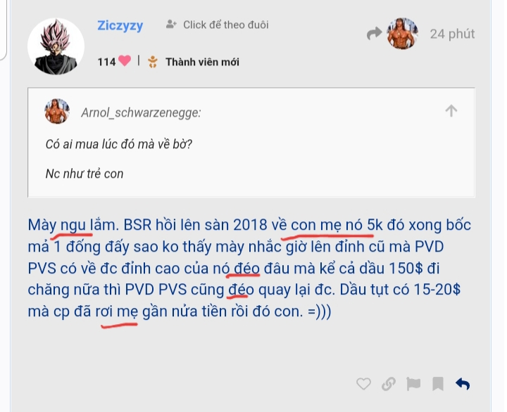 Tôi chưa đánh mã nào do upbo phím, nhưng nể thực sự cái sự hiểu biết và chia sẻ kinh nghiệm của người ta. Ai cũng biết lái cổ phiếu phải có cả đội nhóm vài trăm đến hàng nghìn người (vụ quyết còi phơi bày ra mấy trăm tài khoản đc điều khiển nó là một trường hợp cụ thể nhưng nó là kỹ thuật chung của các đội lái). Động chạm đến lợi ích của các bác thì các bác cay cú có thể chửi bới nhưng chửi ít thôi để chúng tôi có chỗ còn đọc các comment hữu ích (tôi đang nghĩ bác thuộc đội nhóm). Ở cái f247 này tôi thấy có upbo (khả năng ko phải là lái) giỏi phân tích kỹ thuật và chia sẻ nhiều kinh nghiệm hay cho anh em, A7 (lái DiG Ceo cũng là hai con tôi theo nhiều nhất và kẹp nhiều nhất) có tầm nhìn chọn cổ chọn ngành phát triển lâu dài . JEAN (nhìn nhận xu hướng và cũng phân tích kỹ thuật giỏi nhưng ít chia sẻ, tuy vậy vẫn có thể học đc từ jean một số thứ trên này). Bác mỗi chửi nhau, mà chửi một lần cho hết tức thì thôi chứ chửi mãi thế. Chửi nhau nó cũng gây ức chế cho chính bản thân mình chứ sướng quái gì. Bác với upbo có thù hằn thì hẹn nhau ra ngoài chém nhau một ông chết một ông sống là xong. Chửi nhau giấu mặt giải đc cái gì, chửi đc thì cũng vẫn ấm ức lắm