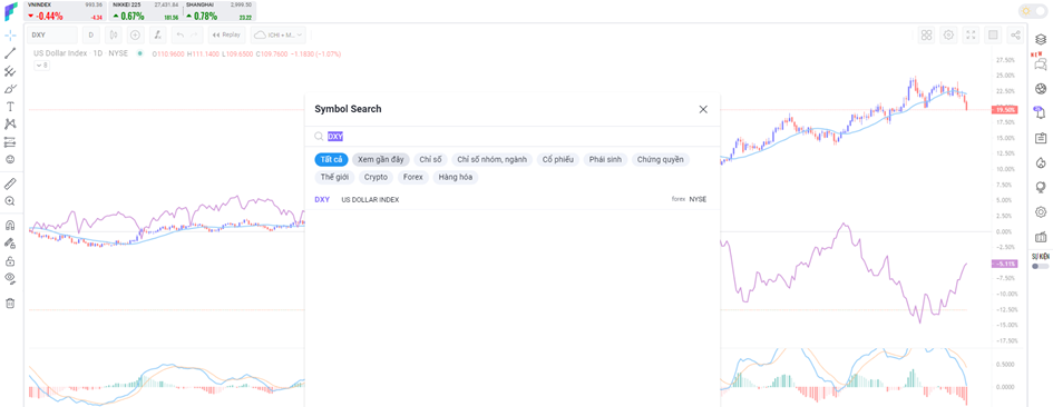 Cách phổ biến nhất mình thường tra cứu là vào Fialda, vào phần “Phân tích kỹ thuật” trên thanh chức năng hoặc nhấn tổ hợp phím tắt Ctrl+8 sau đó bấm vào phần tìm kiếm ở góc trái phía trên. Sau đó bạn tìm kiếm biểu đồ bằng cách nhập “DXY” vào phần thanh tìm kiếm và tiến hành nghiên cứu đánh giá