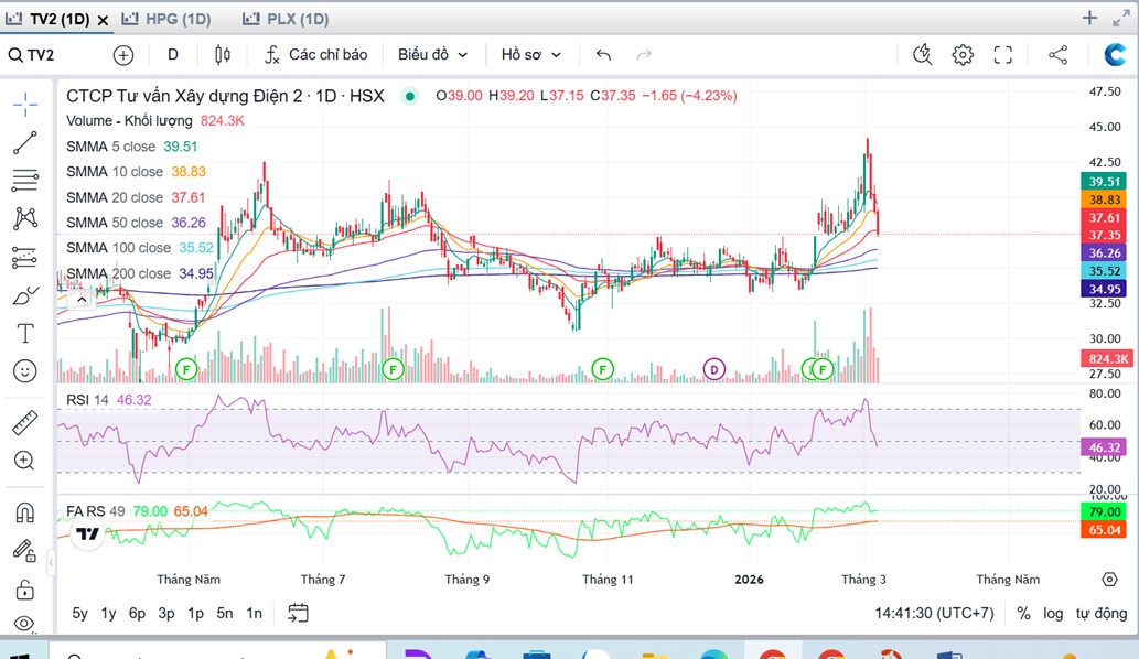 - TV2 vừa trải qua một nhịp tăng mạnh từ vùng ~33 lên ~44–45 trong giai đoạn đầu 2026. Tuy nhiên sau khi chạm vùng đỉnh này, cổ phiếu đã điều chỉnh khá mạnh về quanh 37.