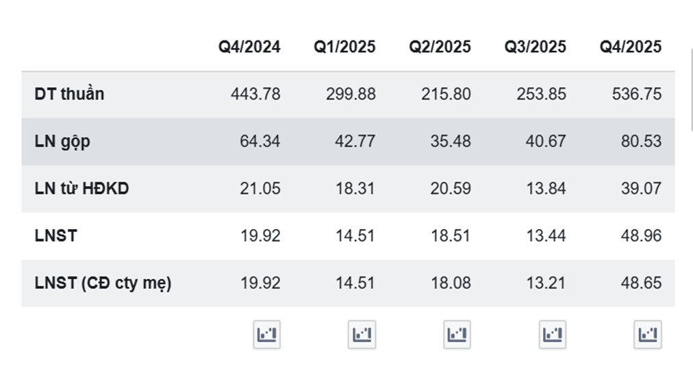 Hiệu quả hoạt động của TV2 cũng có sự cải thiện rõ rệt. Lợi nhuận gộp tăng từ 64,34 tỷ đồng (Q4/2024) lên 80,53 tỷ đồng (Q4/2025), trong khi lợi nhuận từ hoạt động kinh doanh đạt 39,07 tỷ đồng, cao hơn đáng kể so với các quý trước. Điều này cho thấy Công ty Cổ phần Tư vấn Xây dựng Điện 2 đang ghi nhận nhiều dự án có biên lợi nhuận tốt hơn, đồng thời việc kiểm soát chi phí và tiến độ triển khai dự án được cải thiện. Sự gia tăng này cũng phản ánh quá trình phục hồi hoạt động kinh doanh khi doanh nghiệp bắt đầu ghi nhận doanh thu từ các dự án năng lượng lớn trong giai đoạn cuối năm.