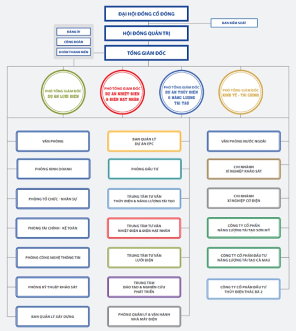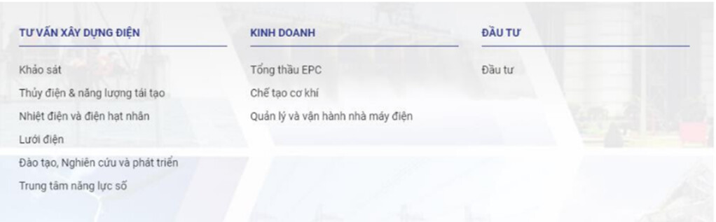 - Mảng kinh doanh (EPC): Bao gồm tổng thầu EPC, chế tạo cơ khí và quản lý – vận hành nhà máy điện. Mảng này thường mang lại doanh thu lớn do giá trị hợp đồng dự án cao, tuy nhiên biên lợi nhuận thường thấp hơn mảng tư vấn vì chi phí thi công, vật tư và quản lý dự án lớn.