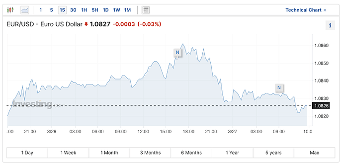 Trên thị trường quốc tế, đồng euro ghi nhận lúc 10h00 giao dịch ở mức 1,0827 USD/EUR, giảm 0,03% so với giá đóng cửa ngày hôm qua (26/3).