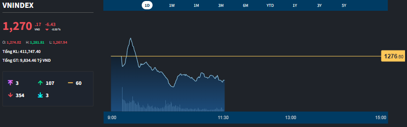 Đỉnh cao nhất chỉ số đạt được là khoảng 9h25, tăng 5,2 điểm so với tham chiếu. Tuy nhiên VN-Index chỉ giữ được màu xanh trong khoảng 10 phút kế tiếp. Chốt phiên sáng chỉ số đã giảm 6,43 điểm tương đương -0,5%.