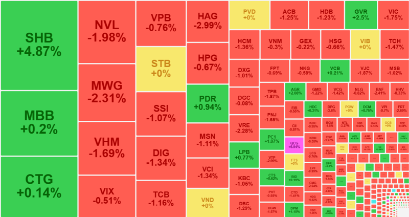 Trong 107 cổ phiếu vẫn còn đang ngược dòng, có 27 mã tăng được hơn 1%, đại đa số là thanh khoản quá nhỏ. Vài mã nổi bật có thể kể tới QCG tăng 6,94% giao dịch 36,2 tỷ đồng; SHB tăng 4,87% với 774 tỷ; GVR tăng 2,5% với 106,7 tỷ; AGR tăng 2,08% với 43,7 tỷ; DPM tăng 1,15% với 34 tỷ; PC1 tăng 1,07% với 59,7 tỷ…
