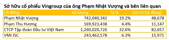 Trước khi giao dịch, số cổ phiếu VIC ông Phạm Nhật Vượng sở hữu là hơn 985,5 triệu cổ phiếu, chiếm tỷ lệ 25,47% vốn điều lệ Vingroup. Sau khi giao dịch, số cổ phiếu ông Vượng sở hữu còn hơn 742 triệu cổ phiếu, chiếm 19,18% vốn điều lệ.