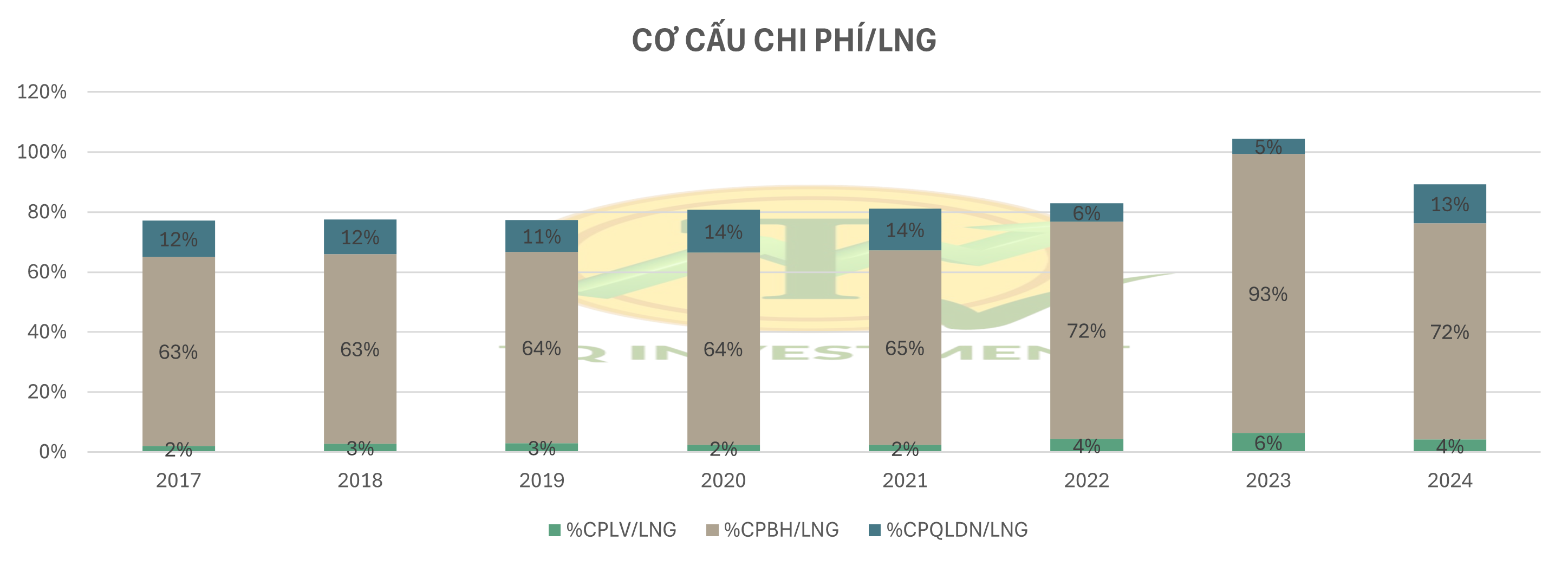 3) Bóc tách các loại chi phí: Việc quản lý tốt các loại chi phí sẽ giúp doanh nghiệp giữ lại được nhiều đồng lợi nhuận hơn trong tổng doanh thu của mình. Thông thường Thành sẽ tập trung vào tỷ trọng chi phí/lợi nhuận gộp của doanh nghiệp để nhận ra khả năng hấp thụ chi phí của doanh nghiệp. Một tỷ trọng các loại chi phí/lợi nhuận gộp cao sẽ đẩy doanh nghiệp luôn ở tình trạng có khả năng cao sẽ báo lỗ. Và nhìn sự thay đổi về các loại tỷ trọng chi phí sẽ đánh giá được doanh nghiệp đang vật lộn với loại chi phí nào, có thể là chi phí lãi vay đang là gánh nặng khi doanh nghiệp hoạt động không hiệu quả nhưng vẫn phải mở rộng đầu tư. Một ví dụ về MWG khi các loại chi phí chiếm tỷ trọng rất cao trong biên lợi nhuận gộp - đặc trưng của ngành bán lẻ khi biên LNG khá thấp. Và chi phí bán hàng sẽ là thứ chúng ta cần quan tâm nhất khi phân tích về MWG.