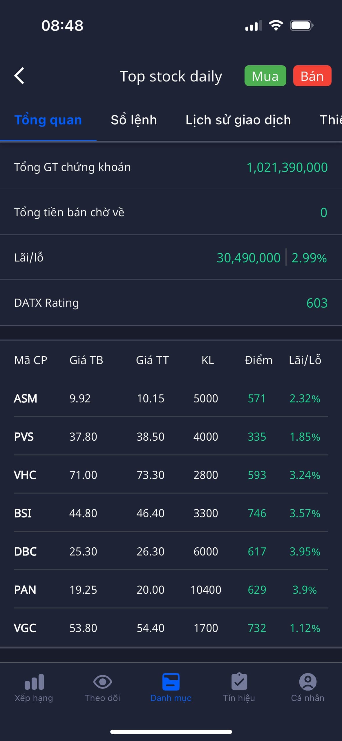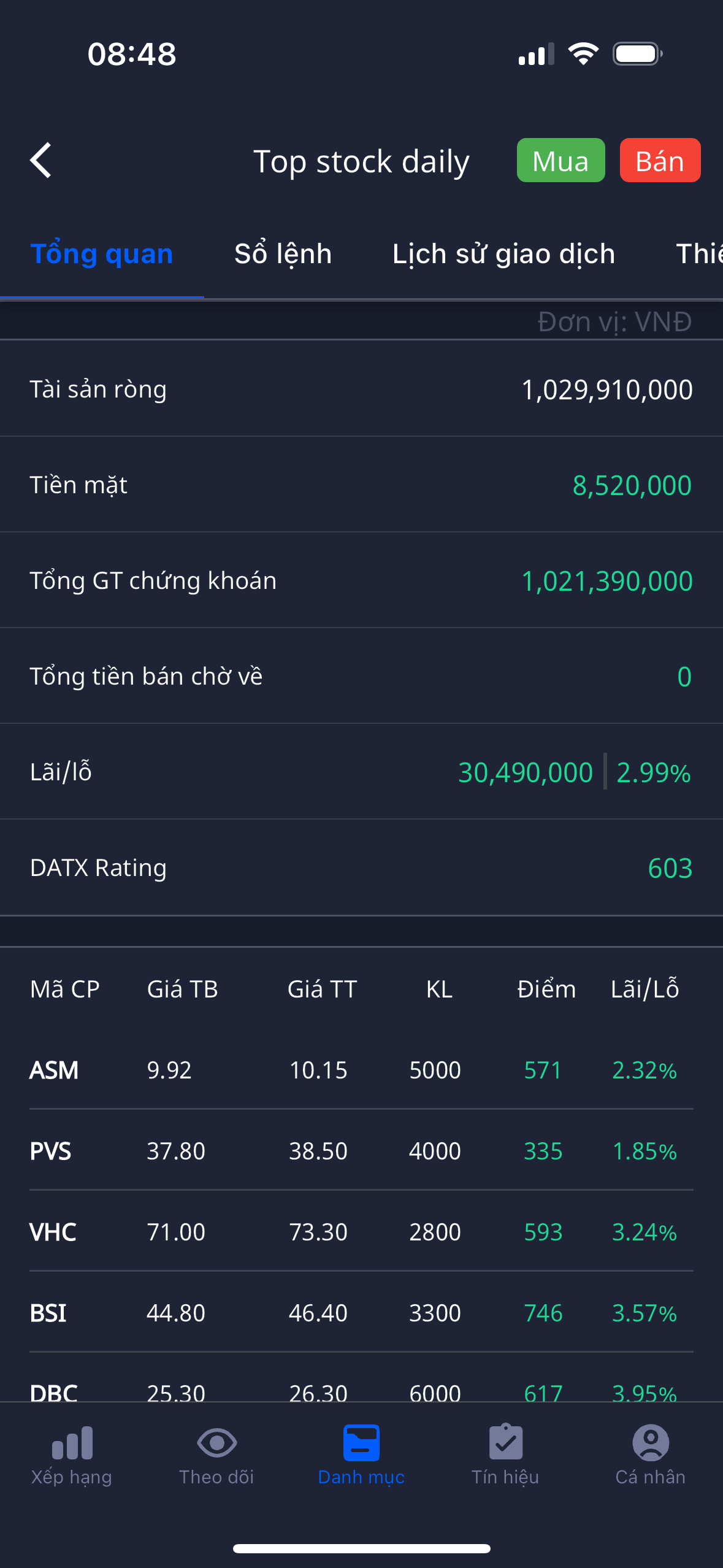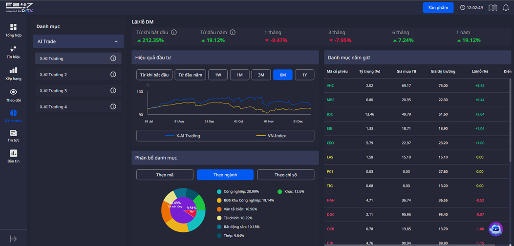 Do đó, các mã cổ phiếu với tỉ trọng 15% hay 20% sẽ là các mã cổ phiếu đáng ưu tiên hơn. Đây thường là những mã cổ phiếu với vốn hóa mid cap trở lên, và thường là các mã cổ phiếu đã có nhiều tín hiệu mua trong quá khứ bởi hệ thống AI của DATX, đồng thời đạt được hiệu quả cao.