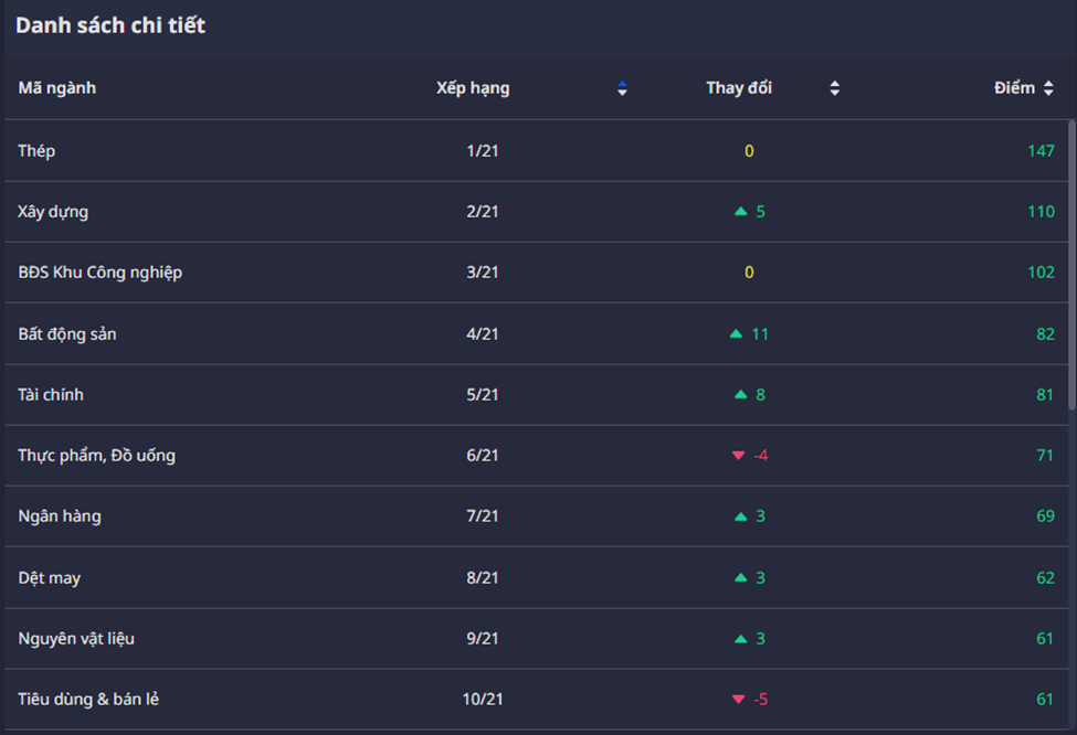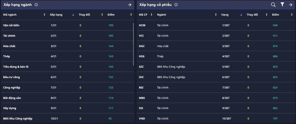 Sử dụng bộ lọc ở trong phần Xếp hạng ngành và Xếp hạng cổ phiếu để chọn mã ngành/cổ phiếu quan tâm