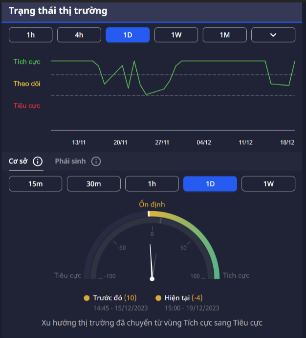 Thường đây cũng là những thời điểm đường Trạng thái thị trường ở ngoài vùng tích cực, đồng hồ rủi ro có giá trị ở mức rủi ro, nhưng có dấu hiệu rủi ro giảm xuống. Đó sẽ là những thời điểm thị trường ở quanh vùng đáy.
