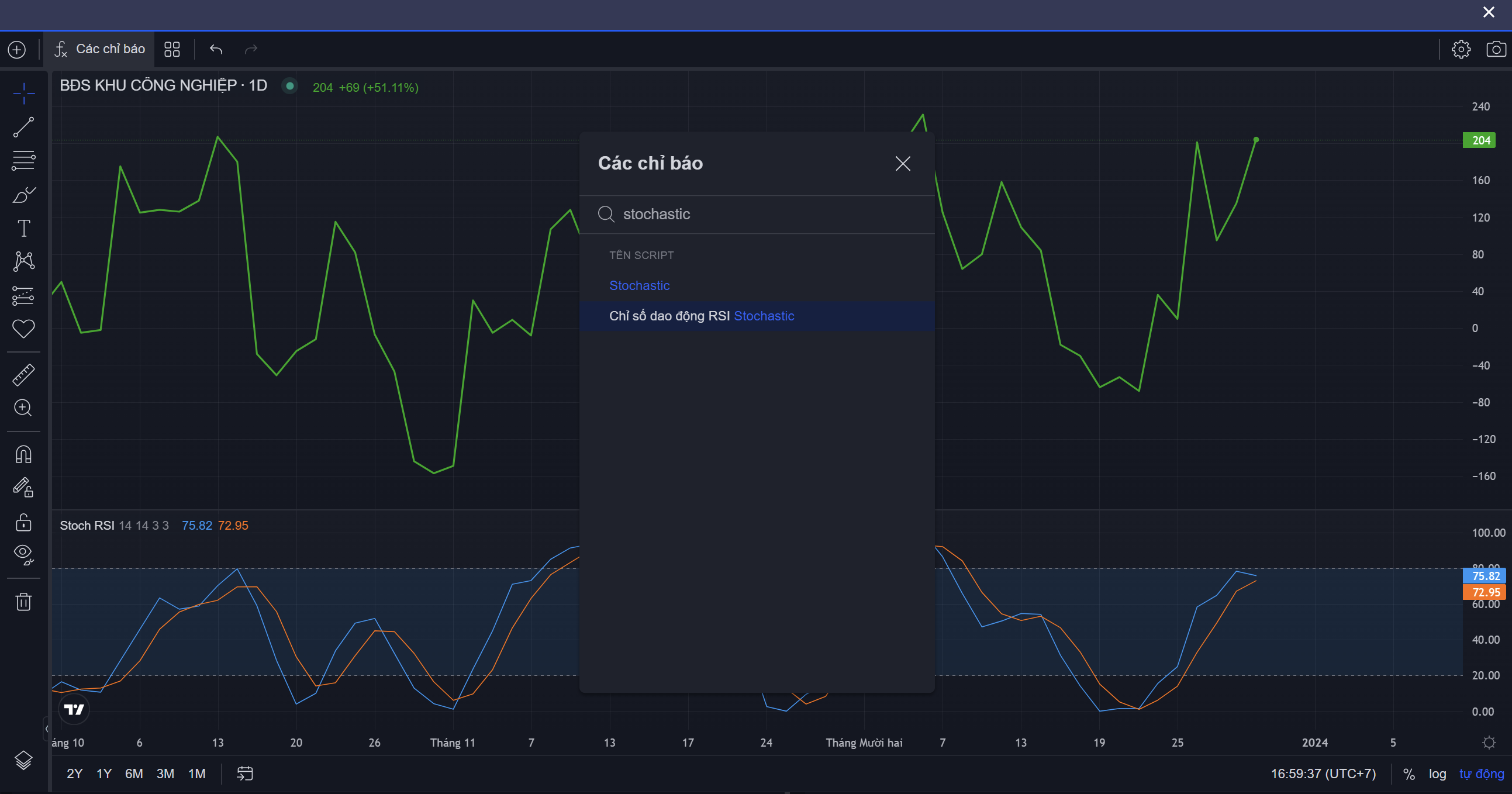 Phóng to biểu đồ, nhà đầu tư có thể áp dụng chỉ báo Stochastic RSI với các setting mặc định lên trên biểu đồ.