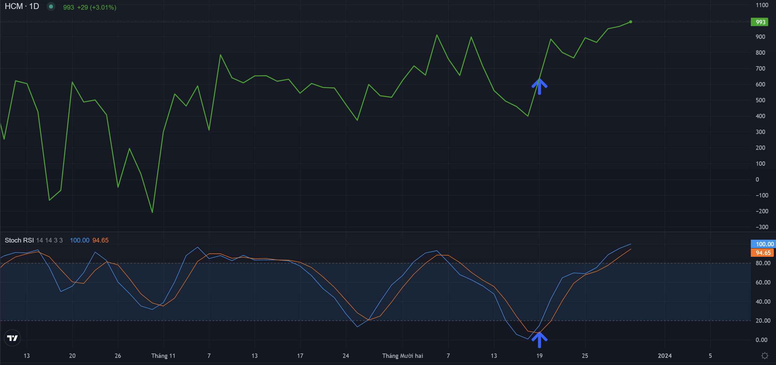 Điểm mua dựa trên StochRSI sẽ là khi chỉ báo này có tín hiệu cắt lên từ vùng quá mua.