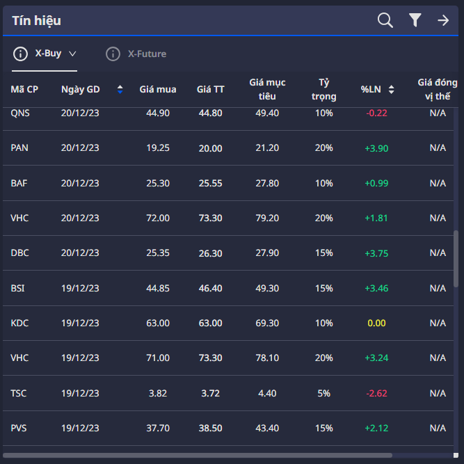 Tín hiệu X-Buy của DATX chính là lối tắt giúp bạn giao dịch đơn giản và hiệu quả. Tại bất cứ thời điểm nào, tín hiệu X-Buy sẽ giúp bạn xác định được: Mua mã nào? Mua tỉ trọng bao nhiêu? Mua giá nào? Giá cắt lỗ/chốt lời. Không chỉ vậy, X-Buy còn giúp bạn xác định thời điểm Bán để đóng các lệnh đã mua. Điều này giúp quá trình đầu tư của bạn trở nên thật dễ dàng.