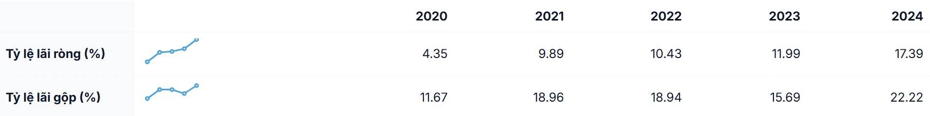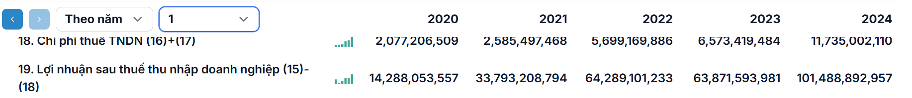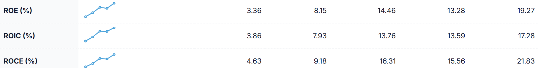 Ngoài ra, cá nhân tôi rất thích theo dõi các chỉ số lợi suất trên vốn, thì cũng giai đoạn 2020 đến 2024, các chỉ số đều tăng đáng kinh ngạc: