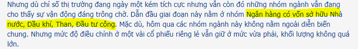 Nhưng dù chỉ số thị trường đang ngày một kém tích cực nhưng vẫn còn đó những nhóm ngành vẫn đang cho thấy sự vận động đáng trông chờ. Dẫn đầu giai đoạn này nằm ở nhóm Ngân hàng có vốn sở hữu Nhà nước, Dầu khí, Than, Đầu tư công. Mặc dù, hôm qua các nhóm ngành này không nằm ngoài diễn biến chung. Nhưng mức độ điều chỉnh ở một vài cổ phiếu riêng lẻ vẫn giữ ở mức vừa phải, khối lượng không quá lớn.