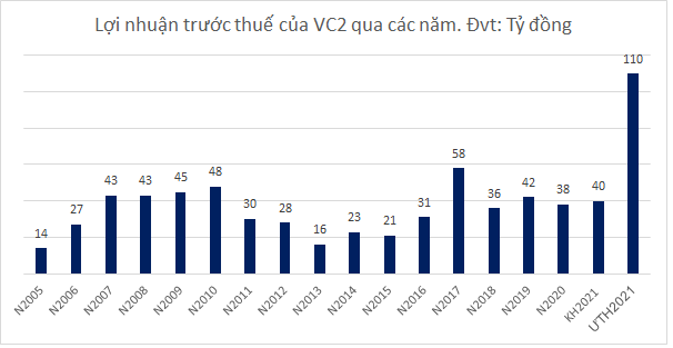 Theo đó, VC2 công bố doanh thu năm 2021 ước đạt gần 947 tỷ đồng và lợi nhuận trước thuế đạt 110 tỷ đồng. So với năm 2020, lợi nhuận ước thực hiện này gấp 2.9 lần. Đây cũng là kết quả kinh doanh cao nhất mà VC2 đạt được trong 16 năm trở lại đây (kể từ năm 2011).