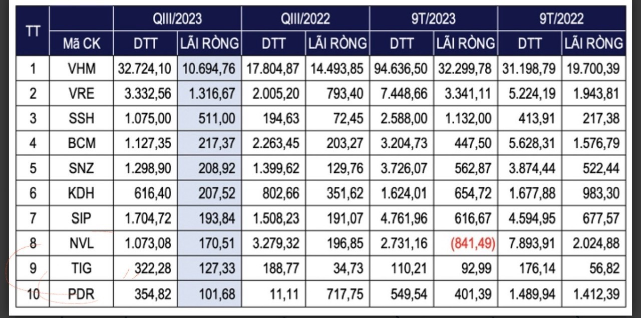 TIG top 10 DN BĐS lợi nhuận tăng mạnh nhất Q3