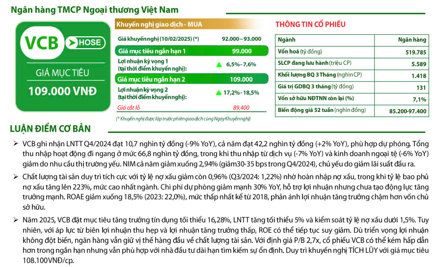 Về tình hình kinh doanh, báo cáo tài chính quý 4/2024 Vietcombank mới công bố cho thấy, nhà băng này tiếp tục đứng đầu ngành ngân hàng lợi nhuận. Cụ thể, lãi trước thuế hợp nhất Vietcombank năm 2024 đạt 42.236 tỷ đồng, tăng 2% so với năm 2023.