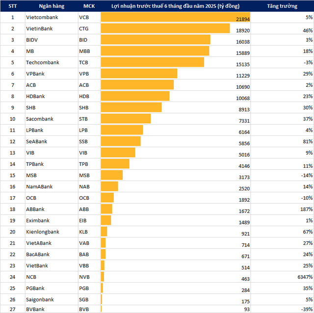 - Lãi trước thuế gần 11,034 tỷ đồng, tăng 9% so với cùng kỳ năm trước. Giữ vững vị trí anh cả với lợi nhuận bán niên dẫn đầu nhóm ngân hàng.
