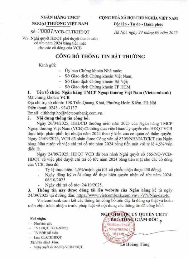 - Vào tháng 8 vừa qua , CP ban hành Thông tư số 23/2025/TT-NHNN bổ sung trường hợp được giảm 50% tỷ lệ dự trữ bắt buộc là tổ chức tín dụng nhận chuyển giao ngân hàng thương mại. Vietcombank là một trong 4 ngân hàng nhận chuyển giao bắt buộc cùng với HDB, MBB và VPB. Đây đều là các ngân hàng có thị phần tín dụng lớn trong hệ thống ngân hàng (chiếm khoảng 25% thị phần dư nợ tín dụng toàn ngành). Việc được giảm 50% dự trữ bắt buộc từ ngày 1/10 tới đây sẽ giúp các ngân hàng này giải phóng một lượng vốn lớn ra nền kinh tế.