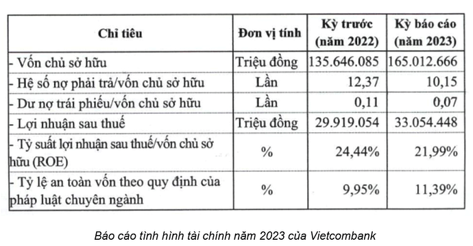 Ngân hàng TMCP Ngoại thương Việt Nam (Vietcombank) vừa công BCTC năm 2023 với vốn chủ sở hữu tăng 29.366 tỷ đồng, tương đương 21,6% và lợi nhuận sau thuế ghi nhận mức 33.054 tỷ đồng.