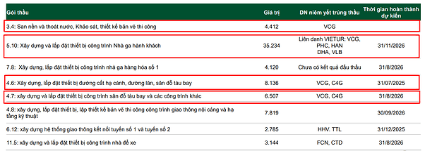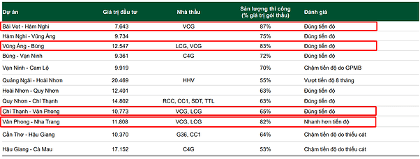Tính đến 12/2024, VCG được đánh giá cao khi đã hoàn thành các dự án trúng thầu trong dự án đường cao tốc Bắc - Nam giai đoạn 2 đúng tiến độ. Tuy nhiên, chưa thấy khoản lợi nhuận đột biến nào được khi nhận trong báo cáo KQKD quý 1/2025. Dự kiến các khoản doanh thu từ các dự án này sẽ được ghi nhận trong các quý tới.
