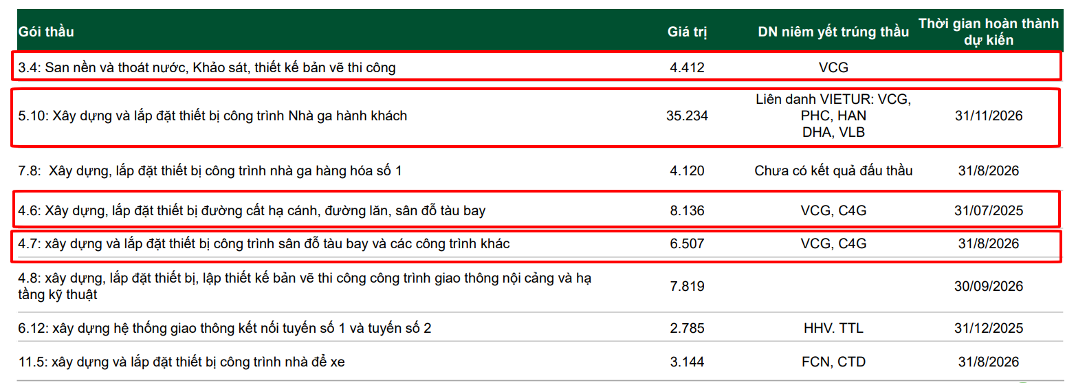 Trong dự án cảng HKQT Long Thành, nhiều gói thầu rơi vào tay VCG trong đó có cả liên danh, hợp tác và độc quyền. Gói thầu lớn nhất là gói 5.10 với tổng giá trị hơn 35 nghìn tỷ, kết hợp với các công ty khác trong liên danh VIETUR. Gói 4.6 và 4.7 hợp tác với C4G (CTCP Tập đoàn CIENCO4) tổng giá trị gần 15 nghìn tỷ. VCG ôm trọn gói thầu 4.120 tỷ San nền và thoát nước, Khảo sát, thiết kế bản vẽ thi công (3.4).
