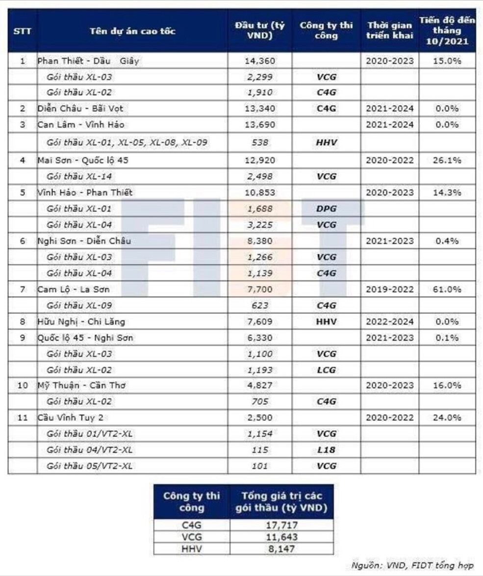 VCG đã thắng 7 gói thầu với tổng giá trị đầu tư ở mức 11,643 tỷ đồng trong gói cao tốc Bắc-Nam.