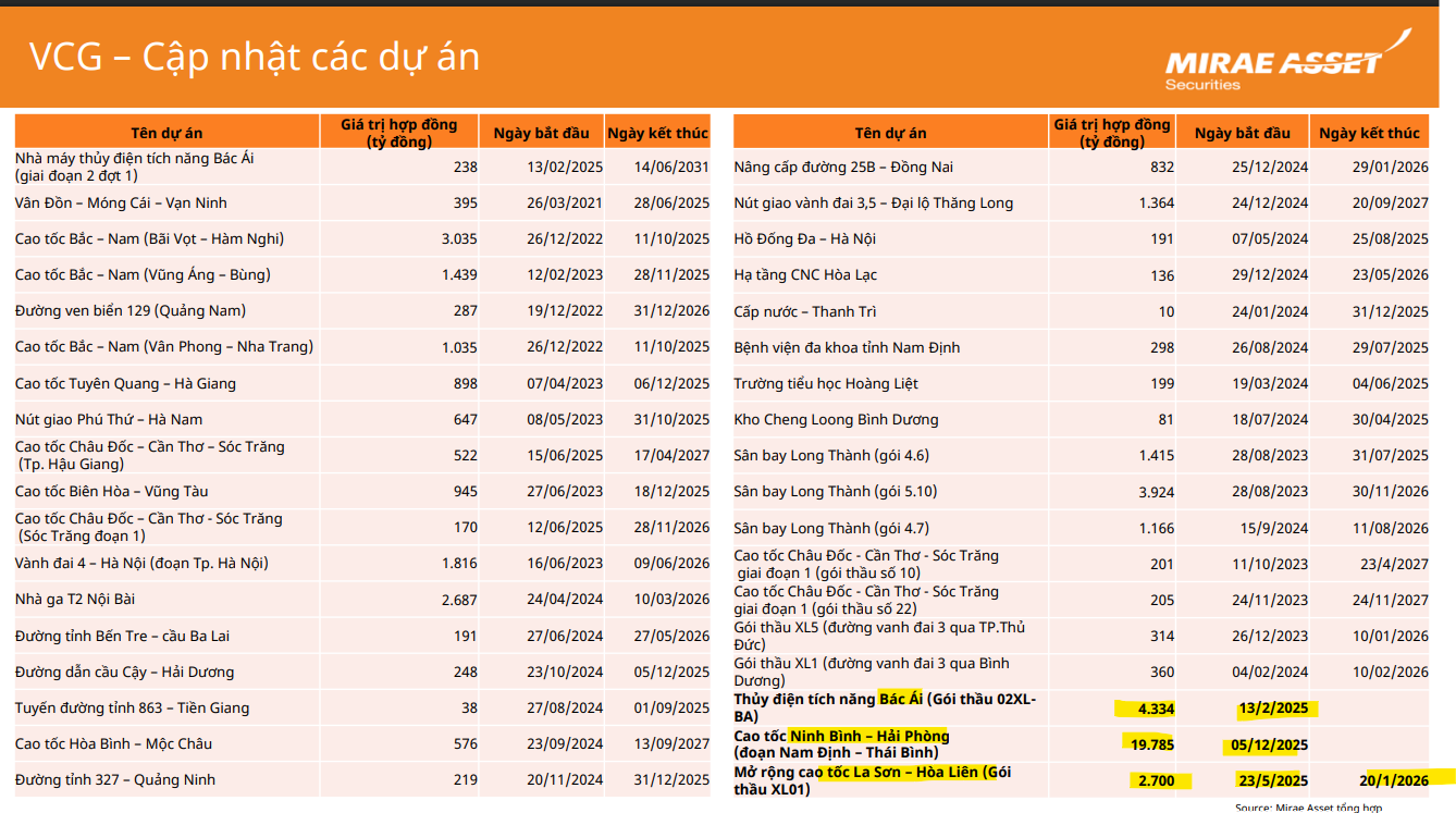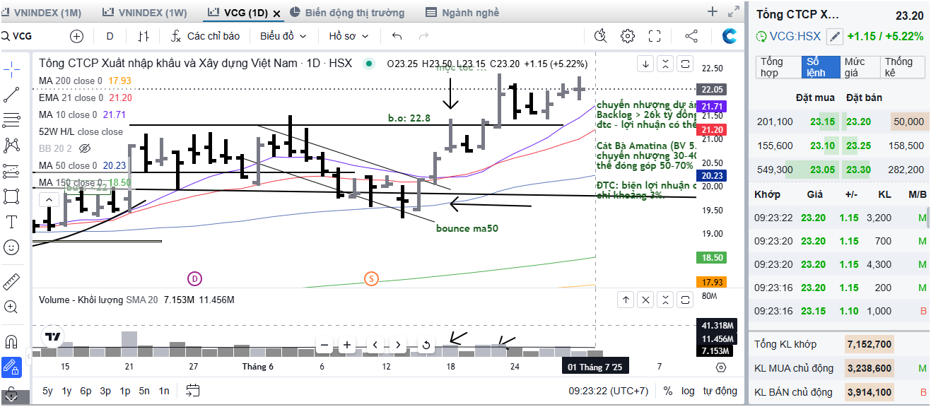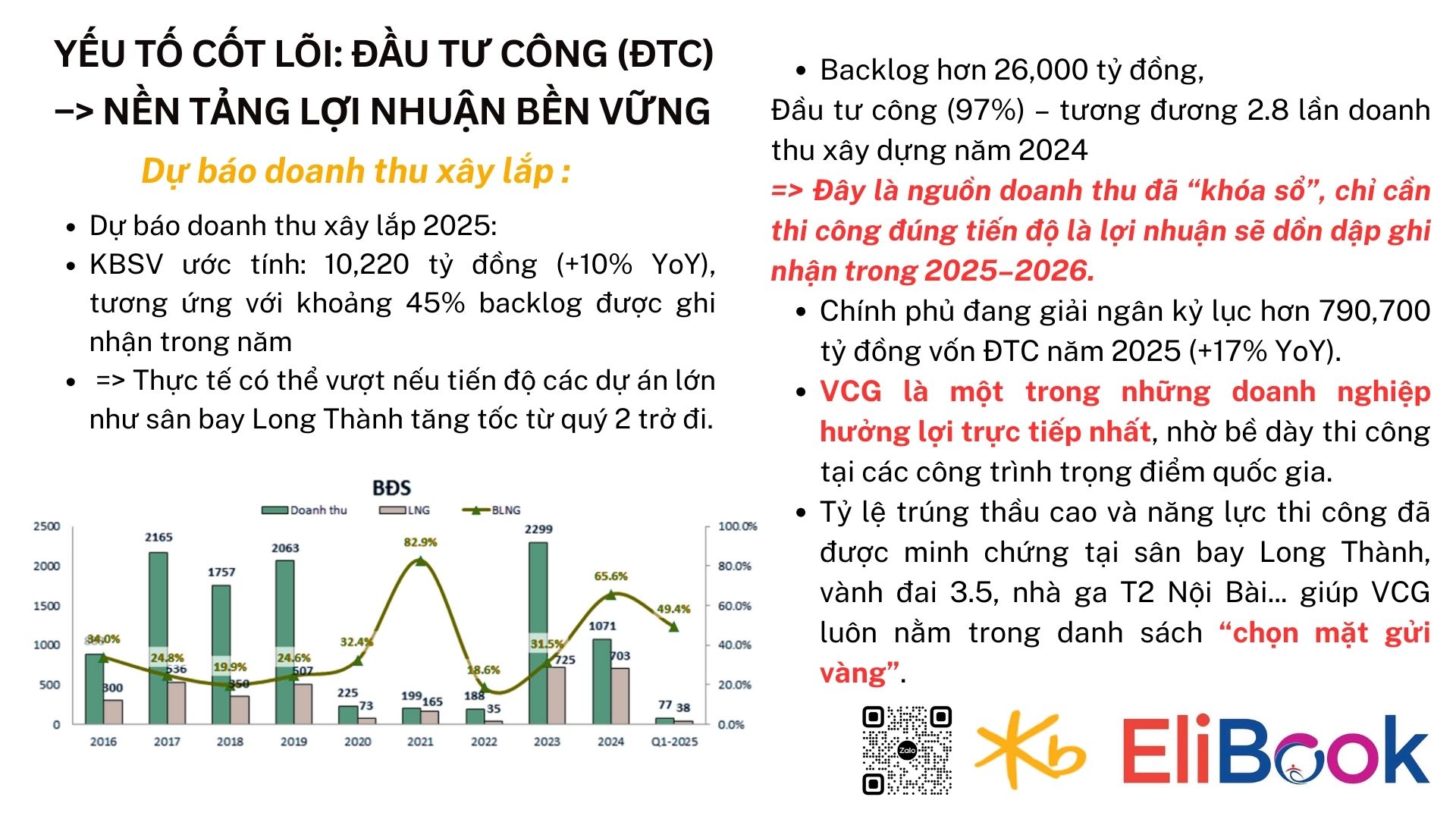 Elibook Team nhận định rằng VCG là cổ phiếu đang trên đà phục hồi sau giai đoạn khó khăn, thể hiện qua việc LNST năm 2024 (+180% YoY), đạt 1,108 tỷ đồng sau ba năm liên tiếp sụt giảm. Dù lợi nhuận quý I/2025 giảm 69% svck, nhưng triển vọng cải thiện vẫn được kỳ vọng trong các quý tiếp theo nhờ tiến độ triển khai các dự án trọng điểm, đặc biệt là sân bay Long Thành, được đẩy mạnh.