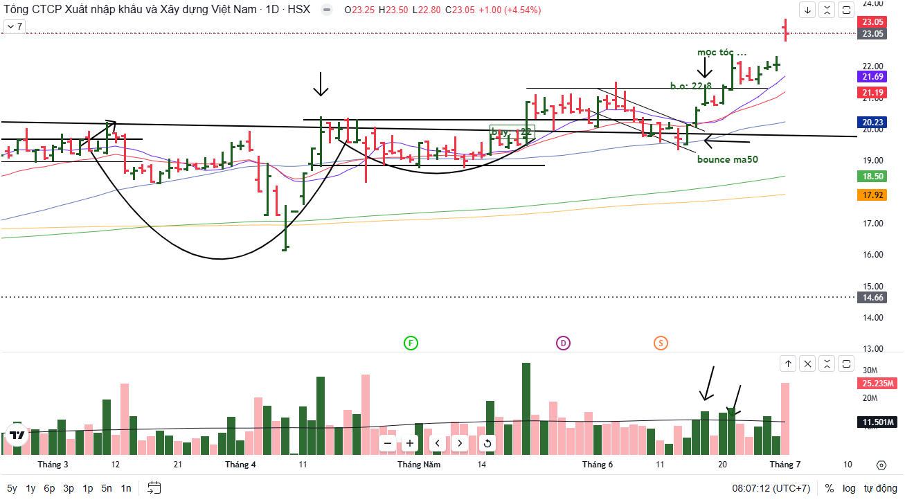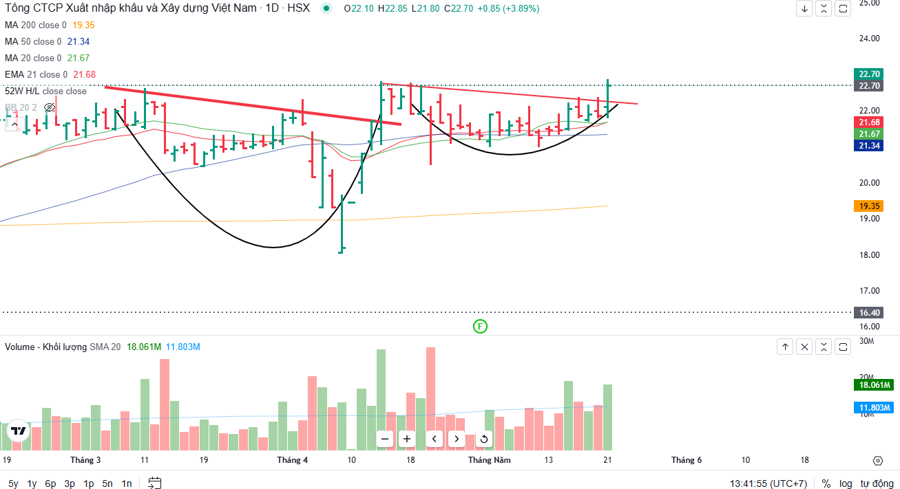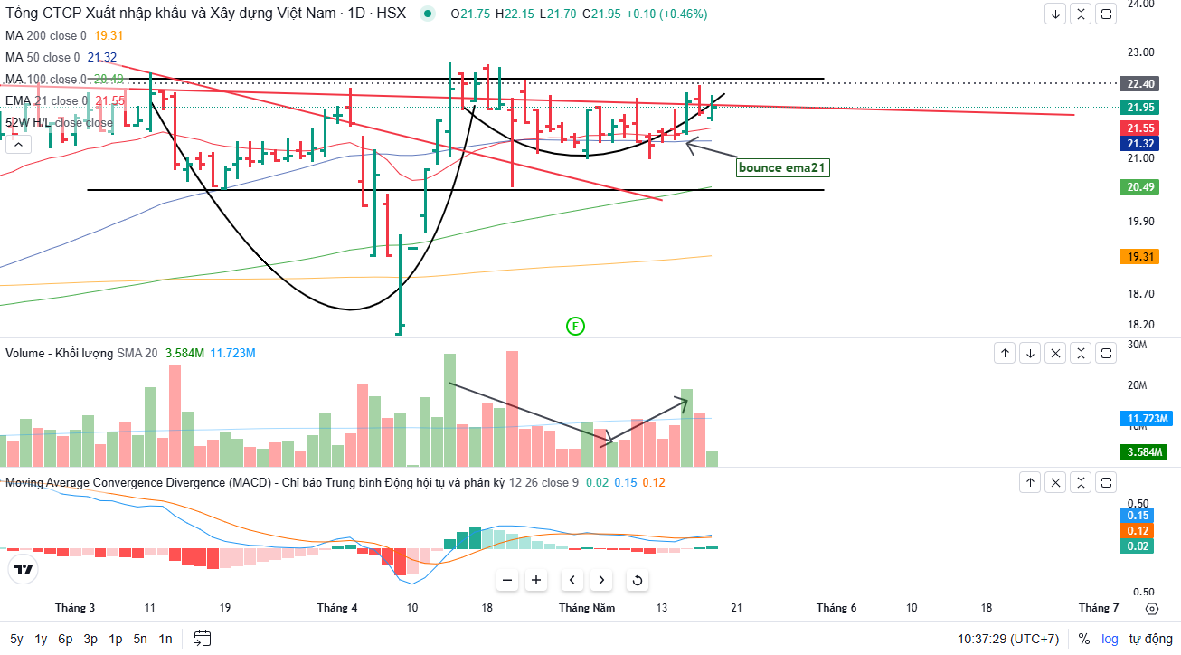 Trên đồ thị kỹ thuật, RS của VCG đã cải thiện lên mức 80 (tuần trước là 76), cho thấy xu hướng tích cực về mặt động lượng giá. Hiện tại, VCG đang trong giai đoạn tích lũy “tay cầm”, và vào ngày 15/5/2025, cổ phiếu đã hình thành điểm “Bounce” tại EMA 21 ngày – một tín hiệu hỗ trợ cho xu hướng tăng giá ngắn hạn.
