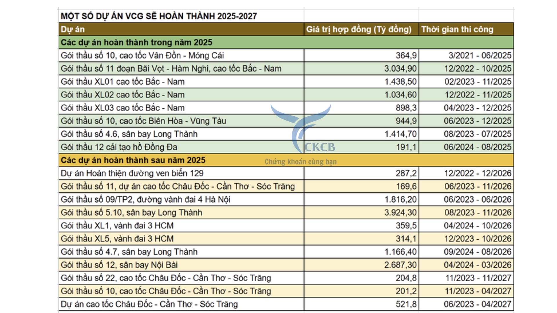 • Từ đầu năm 2025, VCG đã ký kết nhiều hợp đồng lớn với tổng giá trị hơn 26.800 tỷ đồng. Các dự án tiêu biểu gồm: (1) Cao tốc Ninh Bình – Hải Phòng (đoạn Nam Định – Thái Bình), theo hình thức PPP/BOT, VCG là 1 trong 5 nhà đầu tư (~ 19.700 tỷ đồng); (2) Gói XL-04 dự án Thủy điện tích năng Bác Ái (liên danh 7 nhà thầu, ~4.300 tỷ đồng); (3) Gói XL01 mở rộng cao tốc La Sơn – Hòa Liên (liên danh 7 nhà thầu, ~ 2.700 tỷ đồng).".