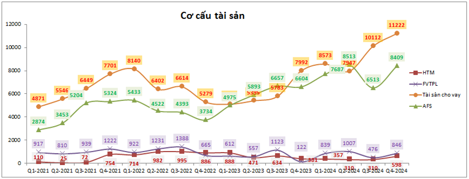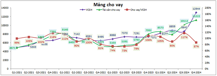 Với việc khoản cho vay tăng khá nhiều trong Q4-2024 (tổng cho vay đạt 11,222 tỷ đồng, cao hơn 1,110 tỷ đồng so với cuối Q3) sẽ giúp lợi nhuận mảng cho vay tiếp tục duy trì ở mức cao. Tuy cho vay có tăng trưởng tốt nhưng chúng tôi cho rằng lợi nhuận mảng này trong các quý tới khả năng sẽ đi ngang hoặc chỉ tăng nhẹ khoảng 5% do lãi suất cho vay có phần giảm khá nhiều để thu hút và cạnh tranh với các công ty khác trong ngành.