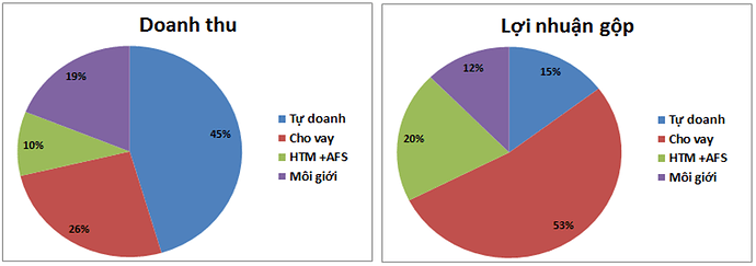 Đóng góp chính vào doanh thu Q4 của VCI là mảng tự doanh và cho vay với lần lượt tỉ trọng 45% và 25%. Nhưng do giá vốn của tự doanh trong Q4 lớn nên lợi nhuận gộp còn lại là rất thấp so với các quý gần đây. Vì vậy mảng cho vay gần như là mảng đóng góp chính vào lợi nhuận của công ty với tỉ trọng 53%. (Hình 3)