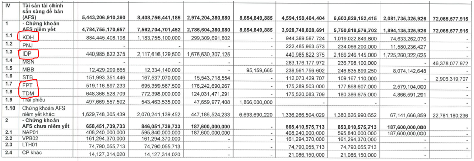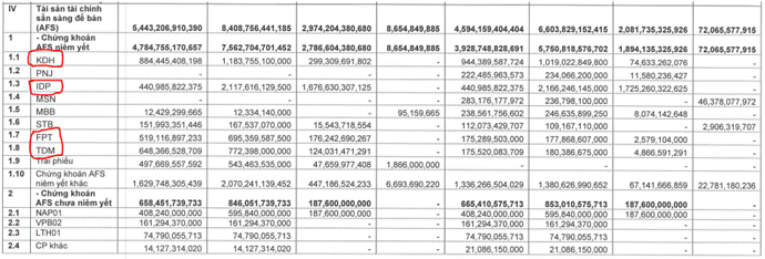 Đây là khoản khá đặc thù của VCI so với các công ty chứng khoán khác khi mà công ty được mua ưu đãi nhiều cổ phiếu tốt trong quá khứ với giá rẻ (giá mua ưu đãi trong các deal phát hành cổ phiếu ra công chúng). Đáng chusvowis các cp có tỉ trọng cao như KDH, IDP, FPT, TDM,… (Hình 6)