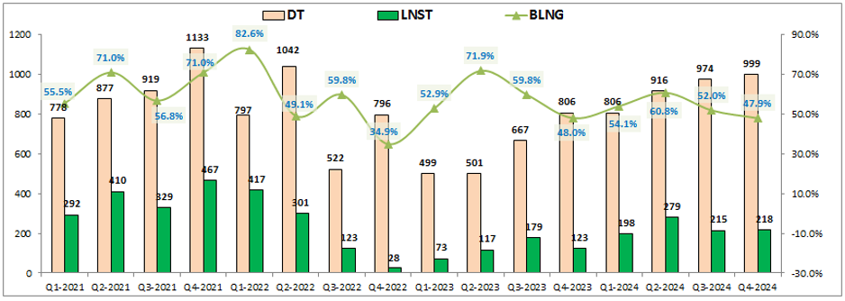 Chúng ta sẽ update nhanh một chút về kết quả kinh doanh của VCI trong Q4-2024. Kết thúc Q4 VCI ghi nhận 999 tỷ đồng doanh thu, tăng 24% yoy. Lợi nhuận sau thuế đạt 218 tỷ đồng, tăng 77.6% yoy. Tuy nhiên nếu so với kết quả đạt được 3 quý đầu năm thì lợi nhuận của VCI có phần đi ngang. (Hình 2)