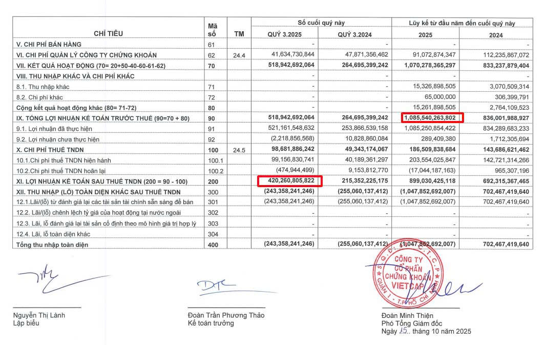- Lợi nhuận sau thuế trong Quý 3/2025 đạt 420,3 tỷ đồng, tăng 95% so với Quý 3/2024. Lợi nhuận trước thuế 9 tháng đầu năm 2025 ghi nhận 1.086 tỷ đồng, tăng 30% so với cùng kỳ năm trước.