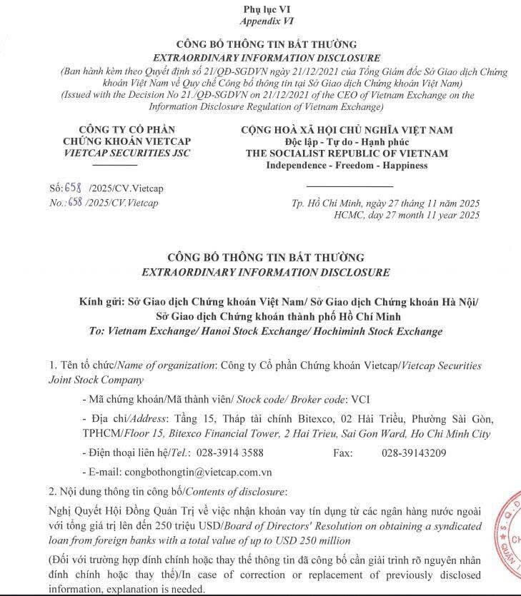 #VCI Nghị quyết hội đồng quản trị về việc nhận khoản vay tín dụng 250 triệu USD từ các ngân hàng nước ngoài.