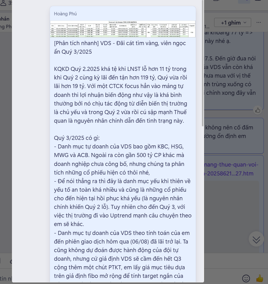 - Danh mục tự doanh của VDS theo tính toán của em đến phiên giao dịch hôm qua (06/08) đã lãi trở lại. Ta cũng không dự đoán được hành động của đội tự doanh, nhưng cứ giả định VDS sẽ cầm đến hết Q3 cộng thêm một chút PTKT, em lấy giá mục tiêu dựa trên giả định fibo mở rộng để tính target ngắn của các mã nhé, câu chuyện dài hạn ta chưa bàn đến vì đây là case trong riêng Quý 3