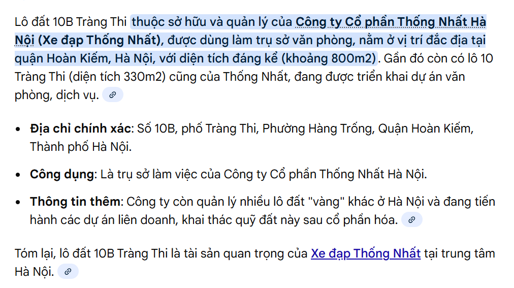 Năm 2019-2020 tận dụng Covid chúng nó ăn mất 330m số 10 Tràng Thi của TNV, thông qua chiêu liên doanh hợp tác xong bán vốn. khi đó, chúng nó thoái vốn liên doanh tính toán dự án văn phòng Viha trên đất 330m đó hết vòng đời tạo doanh thu 400 tỷ, lợi nhuận 200 tỷ, nên TNV bán 11% vốn công ty liên doanh giá loanh quanh 50k/cổ. cũng may mảnh 800 ở 10B Tràng Thi vẫn giữ được, cty đang xây văn phòng (giá trị xây dựng cơ bản đang hơn 5 tỷ theo bctc quý 3). mảnh 800m này nếu định giá 1.5 tỷ/m đất Tràng Thi Hoàn Kiếm, thì 1200 tỷ. riêng mảnh này.