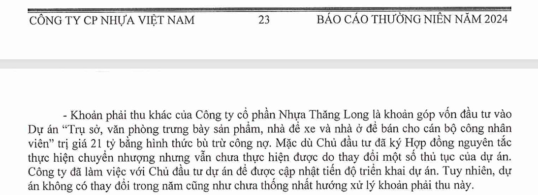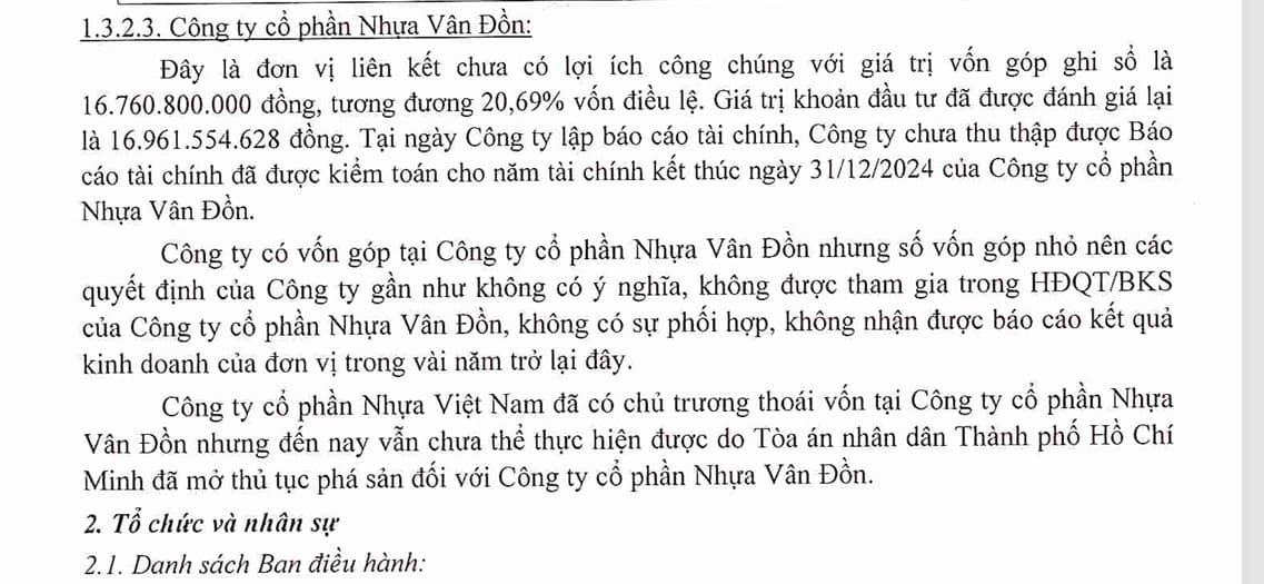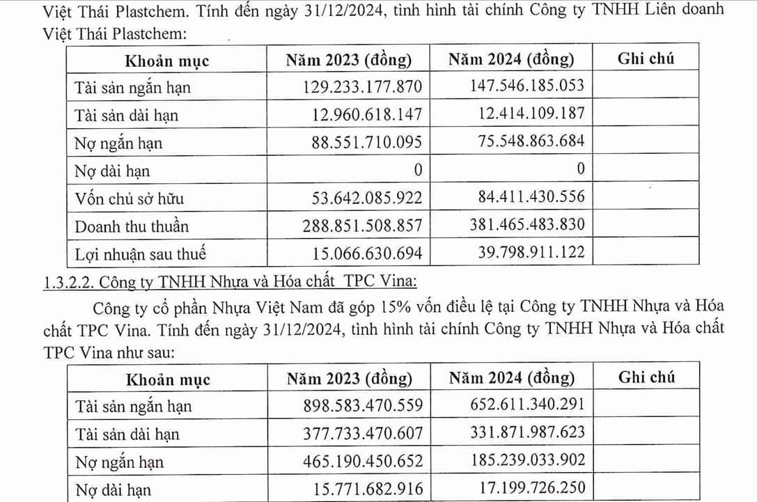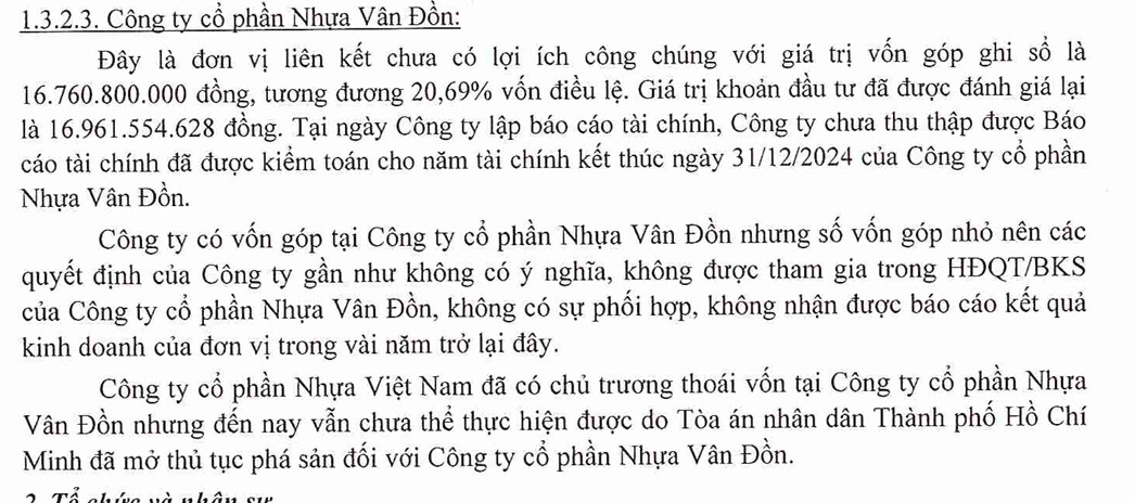 - Bến Vân Đồn. VNP chỉ sở hữu 20.7% công ty Nhựa Vân Đồn. Đáng chú ý công ty Nhựa Vân Đồn đang làm thủ tục phá sản từ năm 2021 đang thụ lý giải quyết. Bản thân VNP muốn thoái vốn nhưng chưa được làm (BCTN 2024).