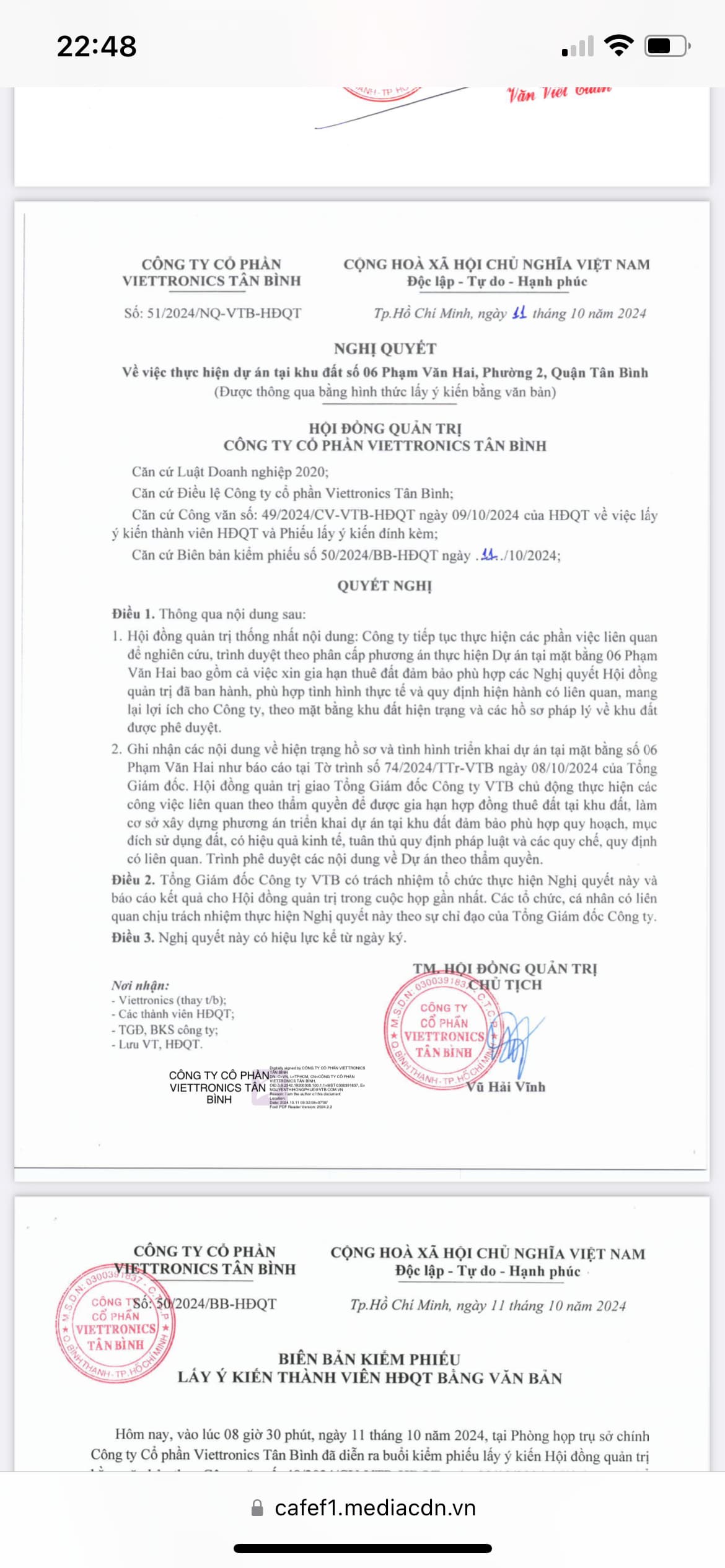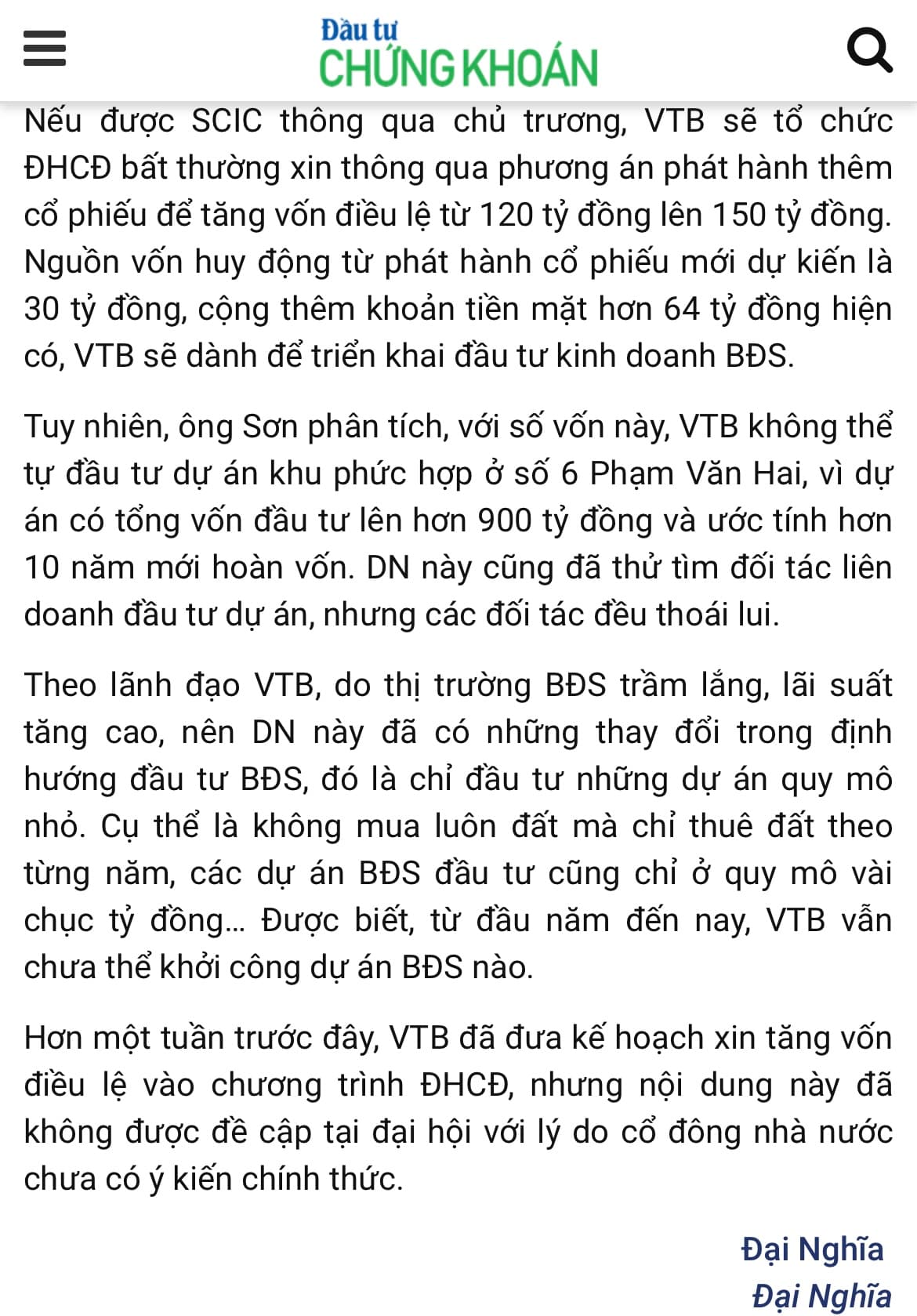 6.500m tại số 6 Phạm Văn Hai: cty rất quyết tâm với Dự án phức hợp, quy mô vốn đầu tư khoảng 1 nghìn tỷ. Năm 2022, cty đã “may mắn” giữ được mảnh đất này khi đã thanh lý hợp đồng hợp tác với HĐTC và Việt Hân (do HDTC vướng lao lý). Cty sẽ triển khai lại Dự án này, thể hiện ở Nghị quyết tháng 10-2024 và lộ trình nêu tại Báo cáo thường niên 2024 của VTB (cty con).