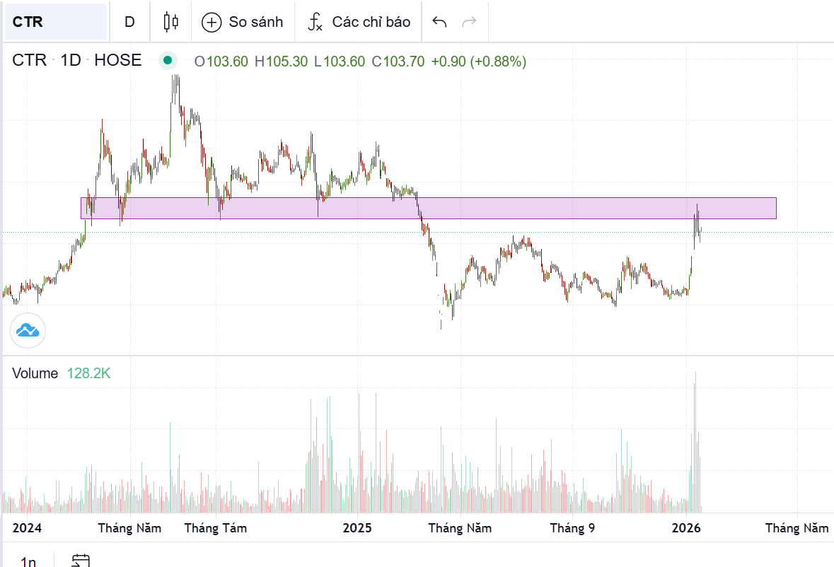 Cùng dòng Viettel: VGI đã tăng gấp đôi vượt đỉnh lịch sử và tiếp tục tăng mạnh chưa thấy đỉnh khi cầu vào mạnh. CTR VTP tăng ít hơn. CTR từ vùng nền tích lũy mới tăng hơn 20%, giá 104 còn cách rất xa đỉnh cũ 158 nên không có lý do gì bán CTR VTP vùng giá này…múc
