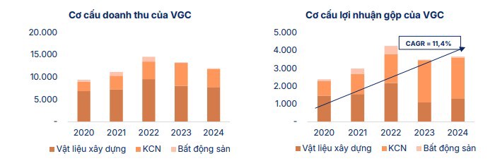 Mảng vật liệu xây dựng của VGC biến động theo chu kỳ thị trường bất động sản. Giai đoạn 2020-2022, khi thị trường bất động sản dân cư bùng nổ, mảng này là nguồn lợi nhuận chính. Tuy nhiên, trong giai đoạn 2023-2024 khi thị trường bất động sản trầm lắng, mảng cho thuê KCN vươn lên trở thành trụ cột chính nhờ dòng vốn FDI vào Việt Nam tăng trưởng liên tục. Điều này giúp VGC duy trì tăng trưởng lợi nhuận ổn định qua nhiều năm.