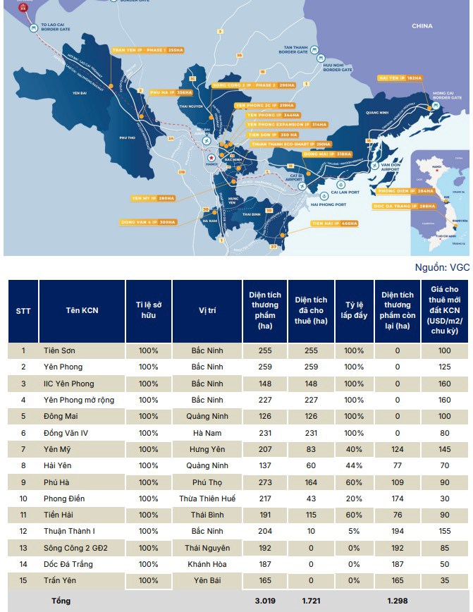 Quỹ đất KCN lớn và vị trí đắc địa: VGC có lợi thế về quỹ đất sẵn sàng cho thuê lớn tại các vị trí chiến lược.