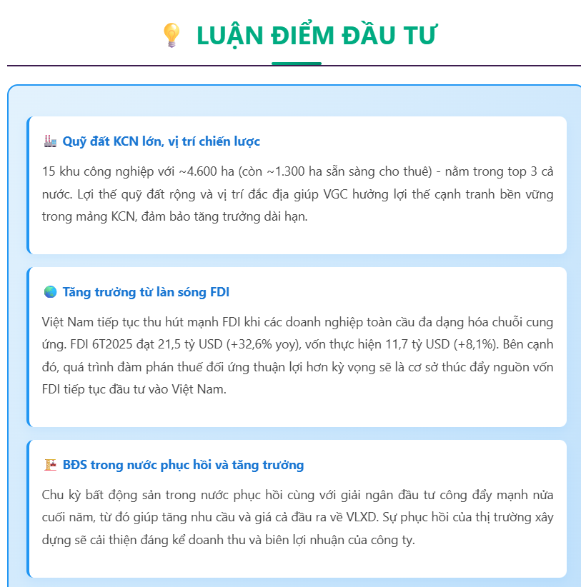ĐỘNG LỰC TĂNG TRƯỞNG: Đến từ mảng cho thuê hạ tầng khu công nghiệp và vật liệu xây dựng, với biên lợi nhuận cải thiện mạnh nhờ nhu cầu thuê đất tăng cao và giá đầu ra VLXD hồi phục.