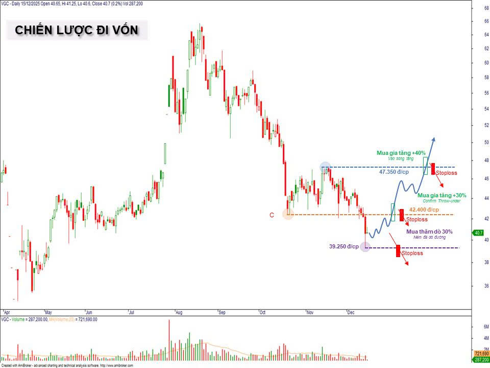 Mua gia tăng: 30% tiền mặt, khi giá tăng lên vượt qua vùng đáy đã thủng trước đó 42.400 đ/cp (confirm về hiện tượng Throw-under)