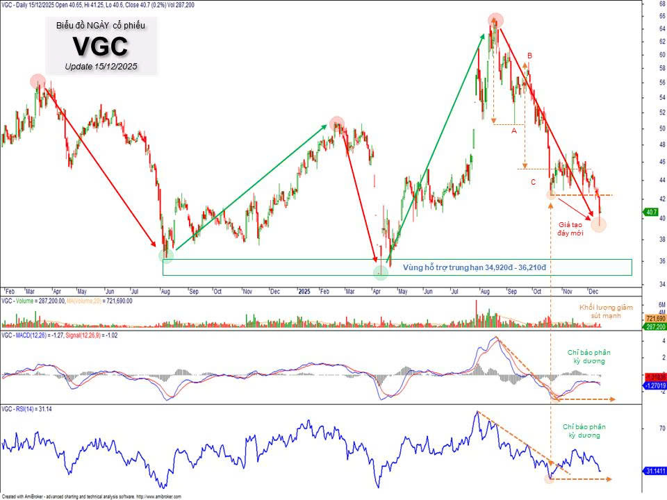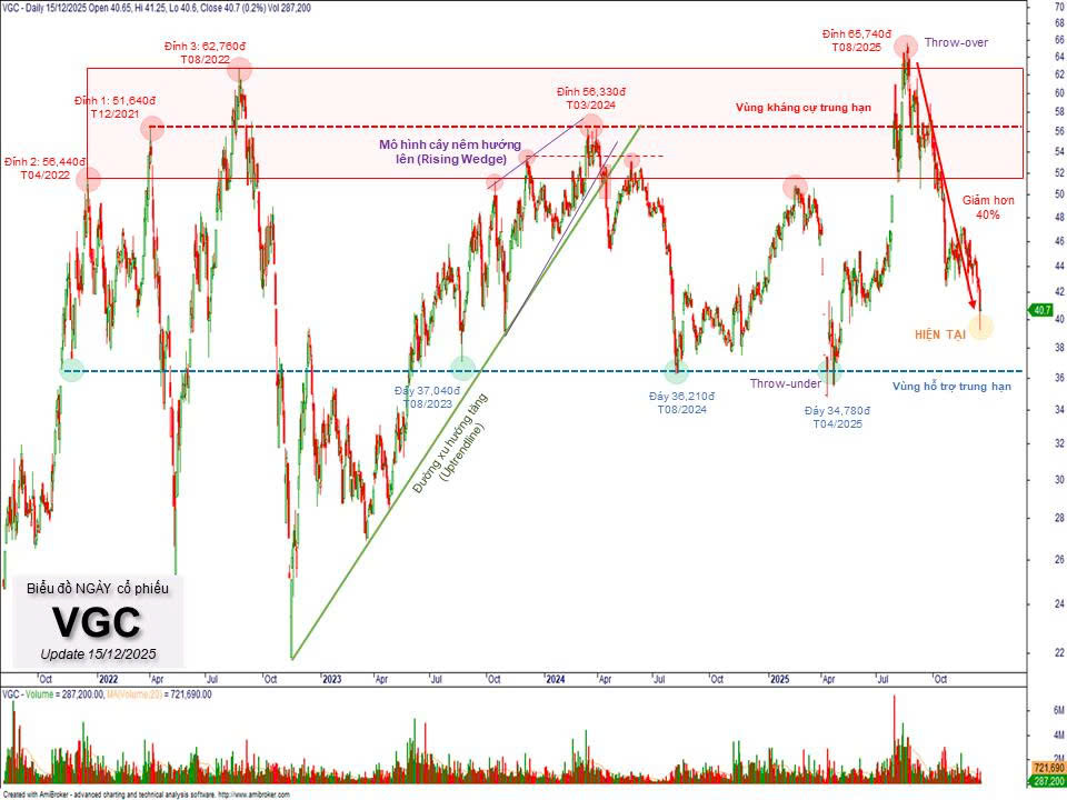Kể từ vùng đỉnh tháng 08/2022, VGC chuyển sang trạng thái dao động đi ngang trong biên độ rộng (Trading Range), được định hình bởi hai vùng giá then chốt: