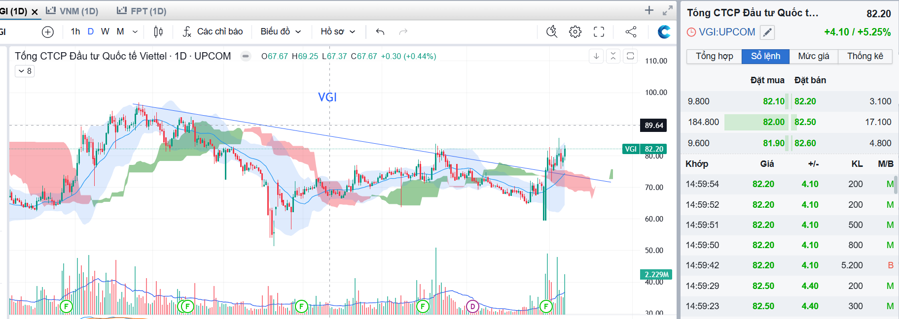 Nhà mình chưa mua đc VGI giá 70-75, có thể canh lại khi cổ phiếu về test lại đỉnh dưới giá 80 nhé.