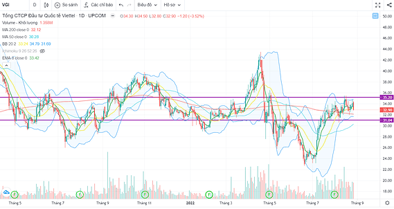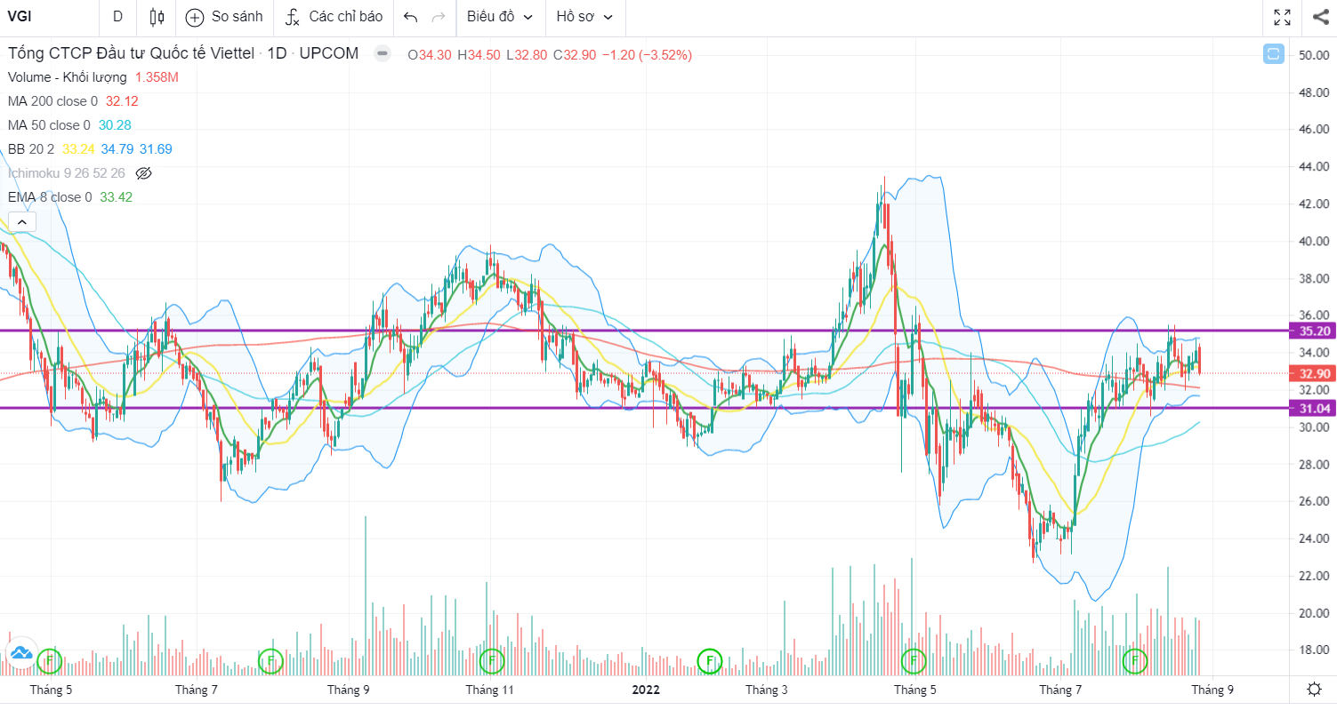 VGI đang tích lũy trong vùng giá 30-35. Đường giá bám sát đường EMA8, và vượt lên MA20, MA50, MA200 cho thấy xu hướng tăng trong ngắn và trung dài hạn. Vùng giá mua hợp lí: 30-33.000 đồng/cổ phiếu.