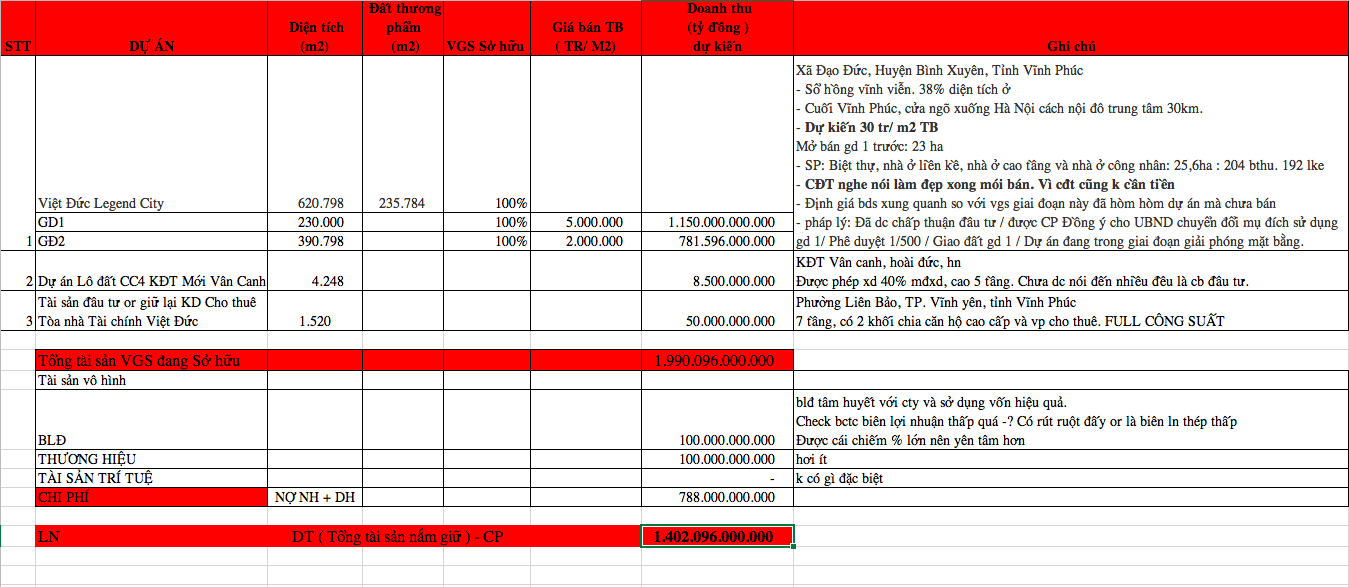 Dựa vào bảng tầm soát về tài sản của VGS - Công Ty Cổ Phần Tập Đoàn Thép Việt Đức ta có bản thu hoạch như sau: